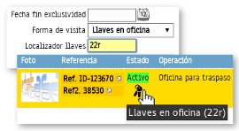 Incluimos el nuevo campo "Localizador llaves" en el alta/modificación de propiedad para registrar el código del cajetín o ubicación de las llaves de la propiedad en tu oficina. Este campo se muestra cuando seleccionas como "Forma de visita" el valor "Llaves en oficina".