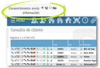Si te interesa contactar con tus clientes para solcitarles el consentimiento por otros métodos, puedes consultar aquellos que aún no lo han dado accediendo a la consulta de clientes "Consulta de clientes" (MENU: Clientes > Búsqueda"), marcando "No" en el campo "Consentimiento envío información". Marcando "Sí" obtendrás la relación de clientes que sí han expresado su consentimiento. Los modelos de documentos de Artekasa ya incluyen el texto pare recoger el consentimiento de tus clientes.