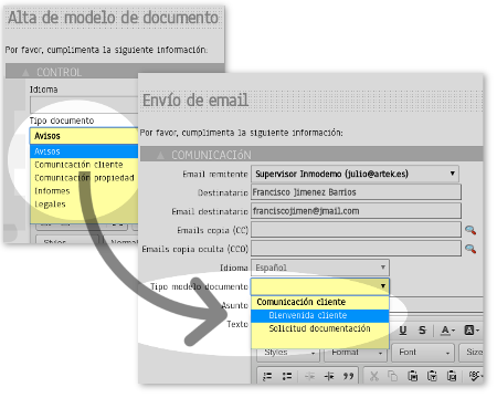 Al enviar un email desde Artekasa, ahora puedes seleccionar en el campo "Tipo modelo documento" un modelo que hayas creado previamente, cuyo contenido se cargará automáticamente en el "Texto" de la comunicación.