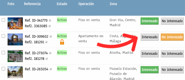 Mejoramos la gestión de los cruces para que puedas registrar fácilmente las preferencias de los clientes compradores/arrendatarios. Tras realizar un cruce (obtención de propiedades para una orden) verás en cada propiedad dos nuevos botones: "INTERESADO" y "NO INTERESADO". Haciendo click en ellos se abrirá una ventana sobre la que podrás introducir observaciones sobre las preferencias del cliente, es decir, porqué le interesa o no le interesa la propiedad en cuestión.