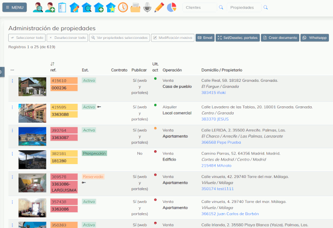 Ahora puedes agrupar propiedades por cualquier criterio, por ejemplo, para relacionar un piso con una o varias plazas de garaje, trasteros, etc. Para hacerlo, accede a "Administración de propiedades" ("MENU: Propiedades > Administración") y selecciona las propiedades a agrupar marcando los registros correspondientes. Después pincha en el botón "Modificación masiva" y en el formulario mostrado marca "Sí" en el campo "Agrupar propiedades".