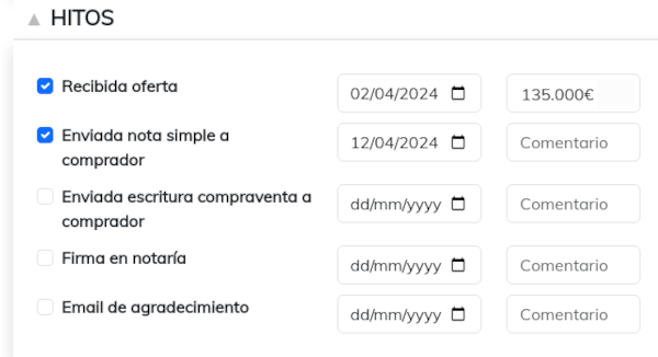 Al acceder al detalle de cada operación, verás la nueva sección "HITOS", en la que se presentan los hitos que tienes configurados. Al marcar un hito como "hecho", deberás incluir la fecha en la que se realizó y opcionalmente un comentario.