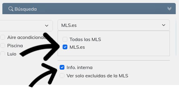 Para buscar propiedades de MLS.es desde Artekasa accede a "MENU: Propiedades > Búsqueda", selecciona "MLS.es" en el desplegable y haz clic en "Buscar". Marca "Info. interna" para que se muestre la información de la inmobiliaria captadora.