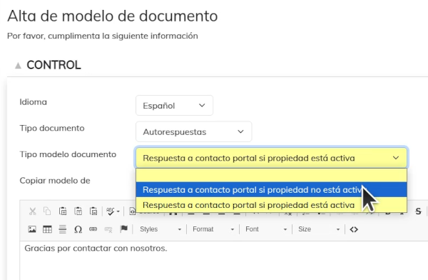 Accede a "MENU: Documentos > Modelos > Alta". Selecciona "Autorespuestas" en "Tipo documento" y "Respuesta a contacto portal si propiedad está activa" en "Tipo modelo documento". Introduce el texto de la respuesta en el editor y pincha en "Alta" para guardar los cambios. Puedes generar una respuesta del mismo modo para propiedades que ya no están activas creando el autorespondedor "Respuesta a contacto portal si propiedad no está activa".